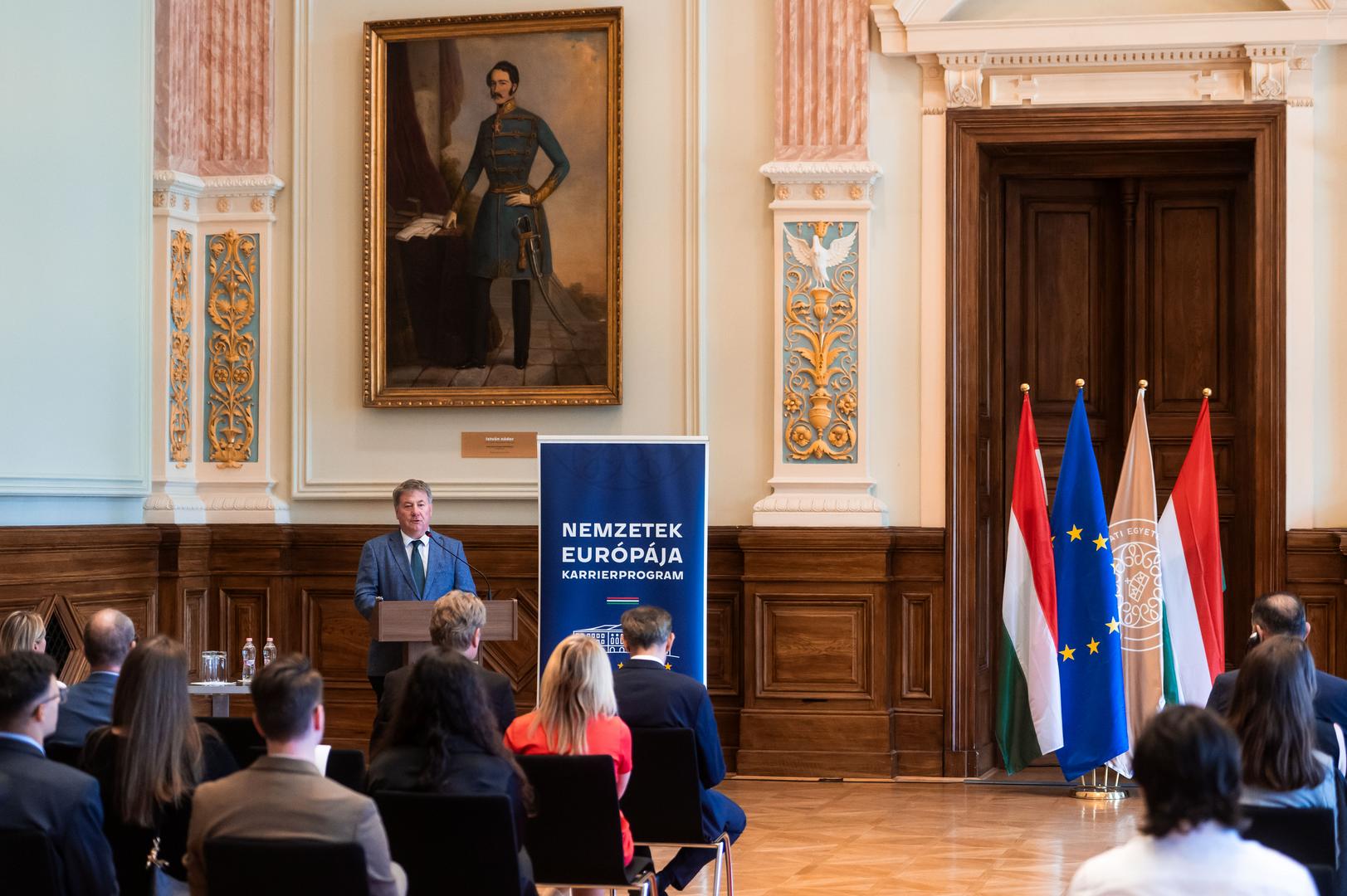 Immár hatodik alkalommal nyitotta meg kapuit a Nemzetek Európája Karrierprogram. Az ünnepélyes tanévnyitó szeptember 15-én zajlott a Nemzeti Közszolgálati Egyetem (NKE) Széchenyi Dísztermében, az Államtudományi és Nemzetközi Tanulmányok Kar (ÁNTK) szervezésében. A 2020-ban indult program – amely az egyetem és az Európai Uniós Ügyek Minisztériuma (EÜM) együttműködésében valósul meg – célja, hogy Magyarország több, az európai uniós intézményeknél elhelyezkedő szakemberrel rendelkezzen. E mellett kiemelten fontos Magyarország hatékonyabb uniós érdekérvényesítésének erősítése és olyan szakemberek képzése, akik rendelkeznek a magyar közigazgatáson belül is szükséges és hasznosítható intézményi, jogi és nyelvi ismeretanyaggal.
