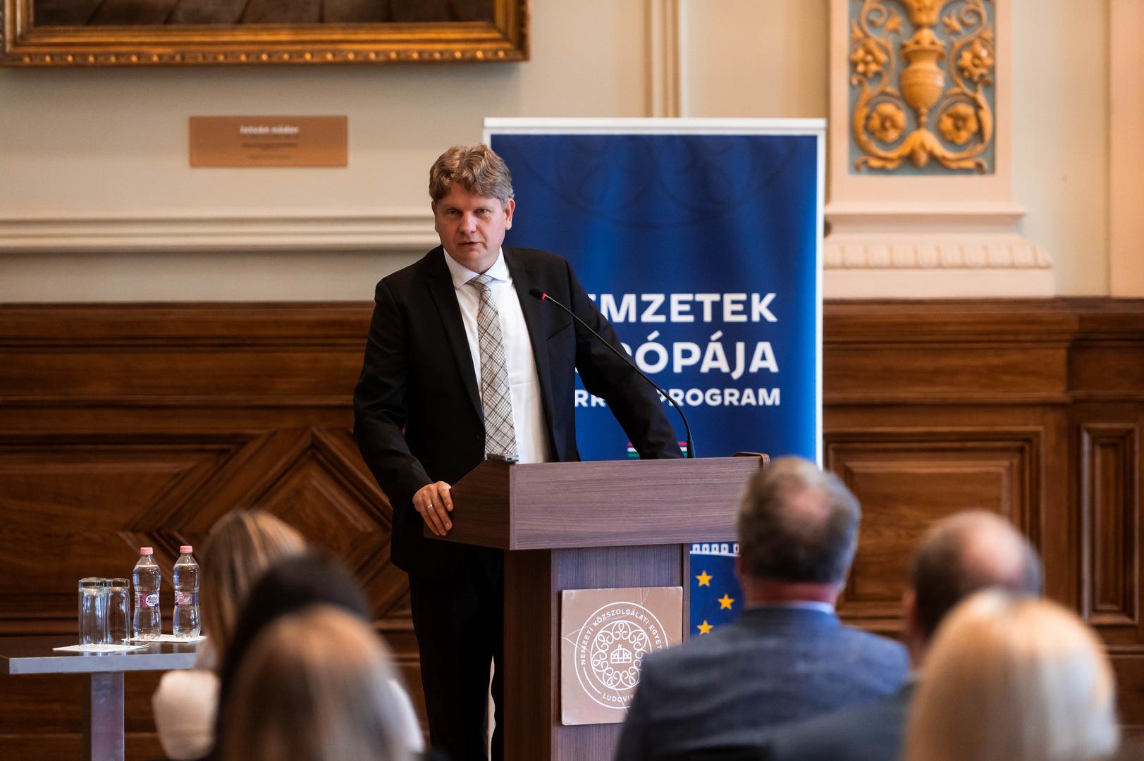 Szegedi László, az NKE oktatási rektorhelyettese beszédében kiemelte: az egyetemnek kiemelt feladata, hogy bázisintézményként biztosítsa az európai uniós intézmények működésének megismerését. Az ÁNTK ennek megfelelően a hazai és nemzetközi közigazgatási szakemberek képzésének központja, ahol többek között külön Európa-tanulmányok Tanszék és Jean Monnet Chair is működik. Szegedi László kitért arra is, hogy az egyetem az elmúlt években aktívan részt vállalt a 2024-es magyar EU-elnökség stábjának felkészítésében, amelyet számos, a programban végzett hallgató erősített. Kiemelte: a képzés nemcsak szakmai tudást ad, hanem hozzájárul a nemzetközi szellemi párbeszédhez és az Európa jövőjét érintő aktuális kérdések megvitatásához. A rektorhelyettes beszédében hangsúlyozta: napjainkban a versenyképesség kérdése egyre inkább előtérbe kerül, miközben a szolidaritás fontossága sem kerülhető meg.