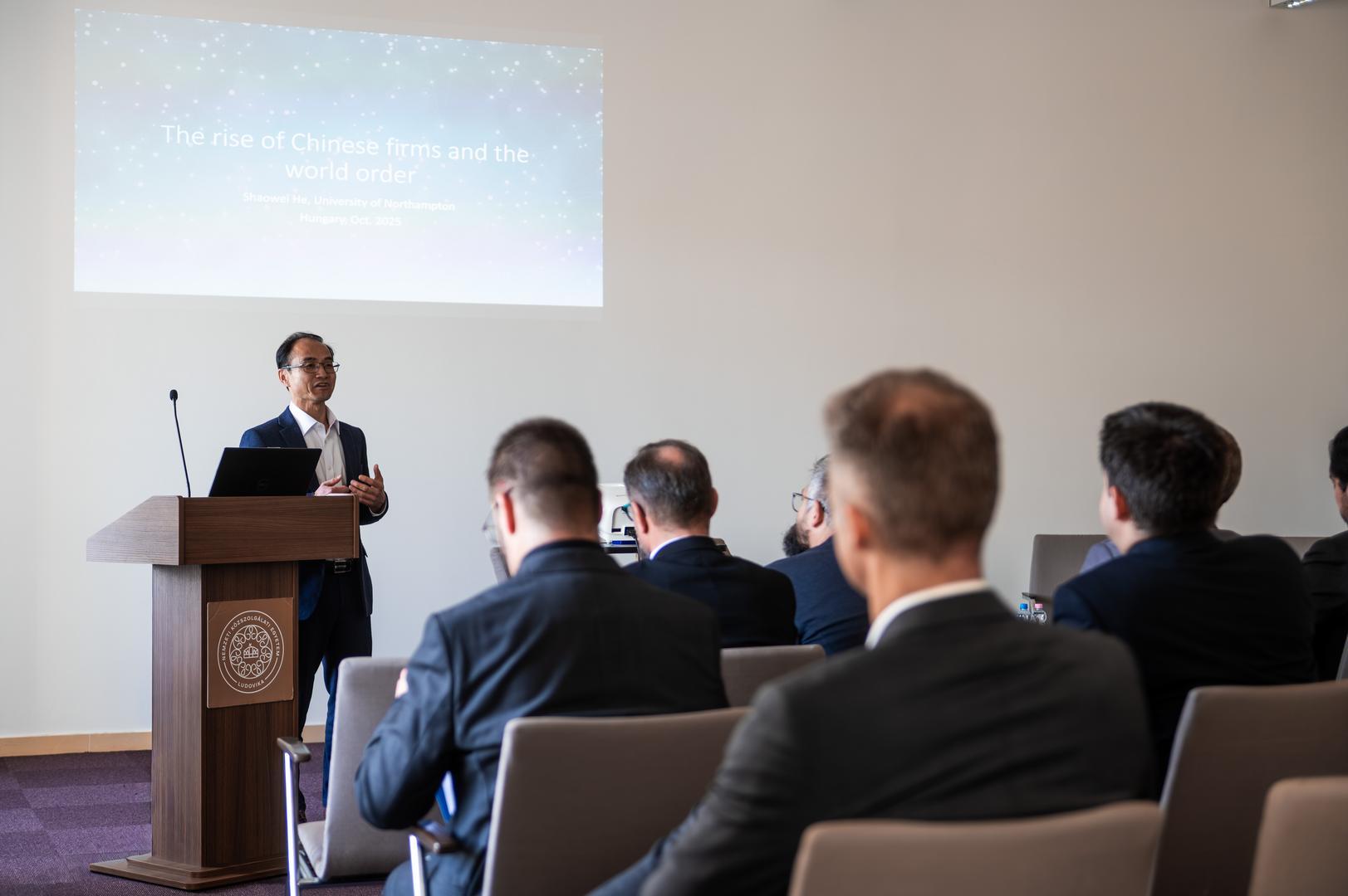 „Normák és intézmények a világrend újraírásában” című nyitóelőadásában Showei He professzor, a University of Northampton oktatója saját kutatásain keresztül mutatta be a kínai vállalatok felemelkedését és innovációs erejét. Felszólalásában emlékeztetett, hogy az elmúlt húsz évben a kínai vállalatok aránya drámaian nőtt a világ legnagyobb cégei között, miközben a hagyományos nyugati gazdaságok (Egyesült Királyság, Németország, Japán, Franciaország) súlya csökkent. A kínai cégek egyre több forrást fordítanak kutatás-fejlesztésre és innovációra, a „gyenge minőségű, olcsó termékek” képe fokozatosan megváltozik. Kína különösen erős az energiahatékonysági, megújulóenergia-, vasúti és elektronikai iparágakban, de még gyengébb például biotechnológiában és mikrochipgyártásban – noha ezekben is gyors fejlődés tapasztalható. A professzor arra is rámutatott, hogy a világrend átalakulása nemcsak politikai és gazdasági intézményekben (mint az IMF vagy a Világbank) érhető tetten, hanem az ipari szabványok és technológiai normák kialakításában is, ahol a kínai cégek egyre nagyobb szerepet játszanak (pl. 5G, 6G, mesterséges intelligencia, robotika, akkumulátoripar). Végül saját kutatásáról beszélt, amelyben kínai vállalatok brit technológiai cégekbe történő befektetéseit vizsgálta: megállapította, hogy a tudásáramlás kétirányú: a kínai cégek ugyan tanulnak a nyugati technológiákból, de a brit leányvállalatok is profitálnak a kínai anyacégek tapasztalataiból – például a vasúti és szélenergia-berendezések fejlesztésében.