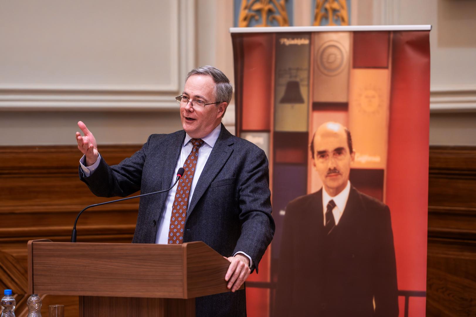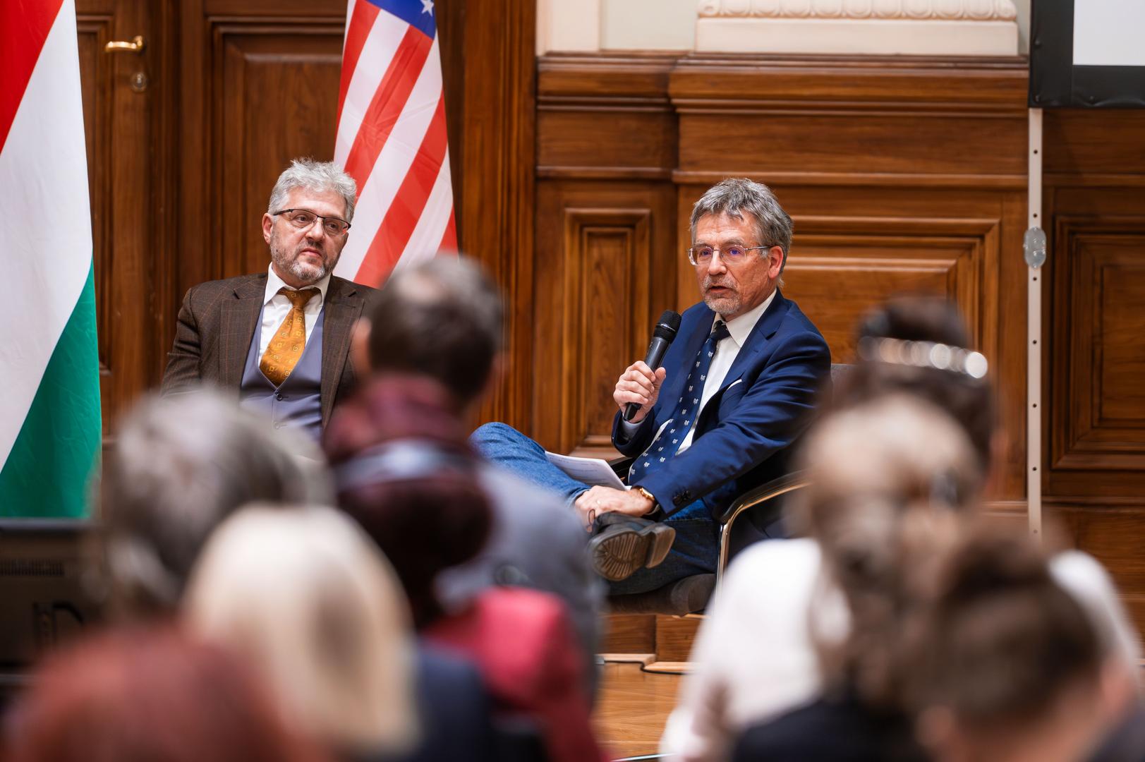 Prőhle Gergely, a John Lukacs Intézet programigazgatója és a Habsburg Ottó Alapítvány igazgatója is köszöntötte a hallgatóságot. Felidézte, hogy 2013-ban több napot töltött Washingtonban John Lukacs és felesége társaságában és kiemelte a történész közvetlenségét. Szintén beszámolt arról a különleges pillanatról, amikor az egyetem pincéjében hosszú ideig lezárt ládák végre 2021-ben megnyíltak, és előkerültek John Lukacs személyes tárgyai: a borospohár, a szivardoboz, az apró emléktárgyak mind hozzájárultak ahhoz, hogy a látogatók közelebb kerüljenek a történész személyiségéhez. Ezek a tárgyak nemcsak emlékek, hanem feladatot is jelentenek: az örökség értelmezését és továbbadását. Az igazgató kiemelte, hogy a 250. évfordulóhoz kapcsolódó programsorozat első pilléreként John Lukacs életműve méltó módon nyitja meg azt a párbeszédet, amely a magyar származású gondolkodók amerikai hozzájárulását vizsgálja.